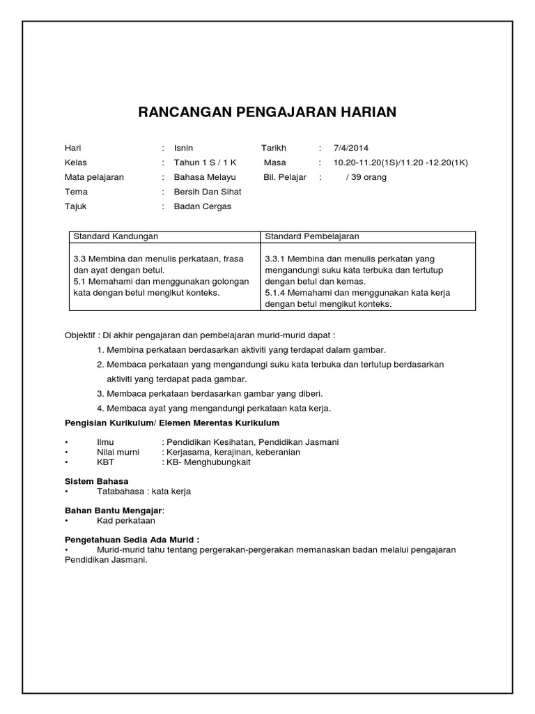Doc Rancangan Pengajaran Harian Bahasa Melayu Tahun 1 Cikgu Mor Academia Edu